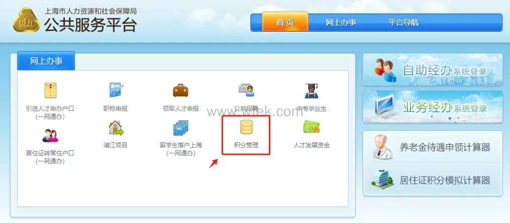 2、进入上海人力资源和社会保障局公共服务平台官网,点击“积分管理”,进入《上海市居住证》积分申请系统。