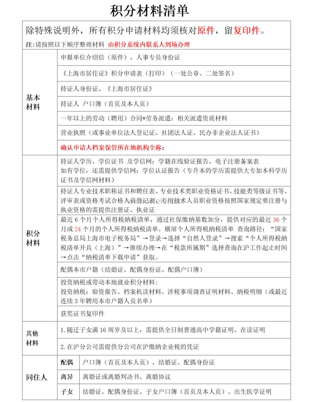 除特殊说明外,所有积分申请材料均须核对原件,提交复印件。对于能够通过调用电子证照、数据共享等方式核验相关申办材料信息的,可免于提交纸质申办材料。在外省市工作期间获得的三级及以上技能等级证书,须通过技能人才评价证书全国联网查询系统或上海市人力资源和社会保障局网站查询核验。