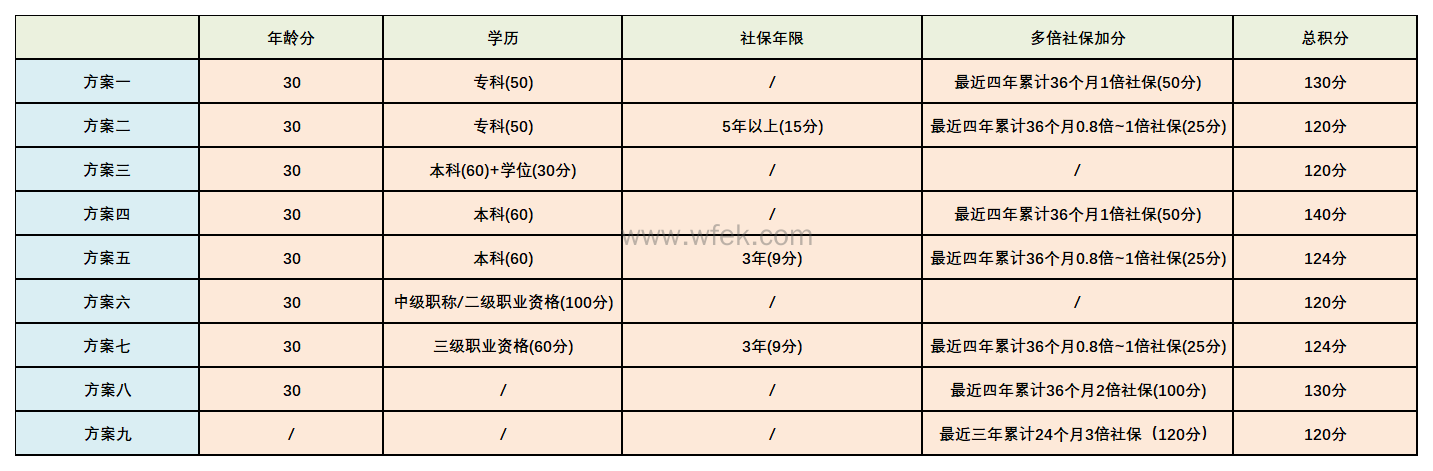 (1)专科(50分)+四年累计36个月1倍社保(50分)+年龄(30分)=130分
