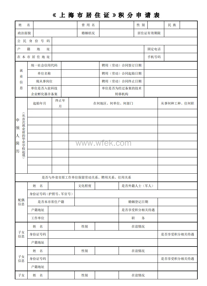上海积分落户(官方)申请表