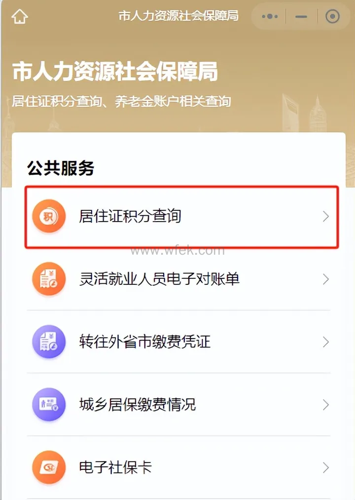 在微信中搜索并关注“上海人力资源和社会保障”公众号,通过菜单栏中的“人社服务”-“人社随申办”找到“居住证积分查询”。