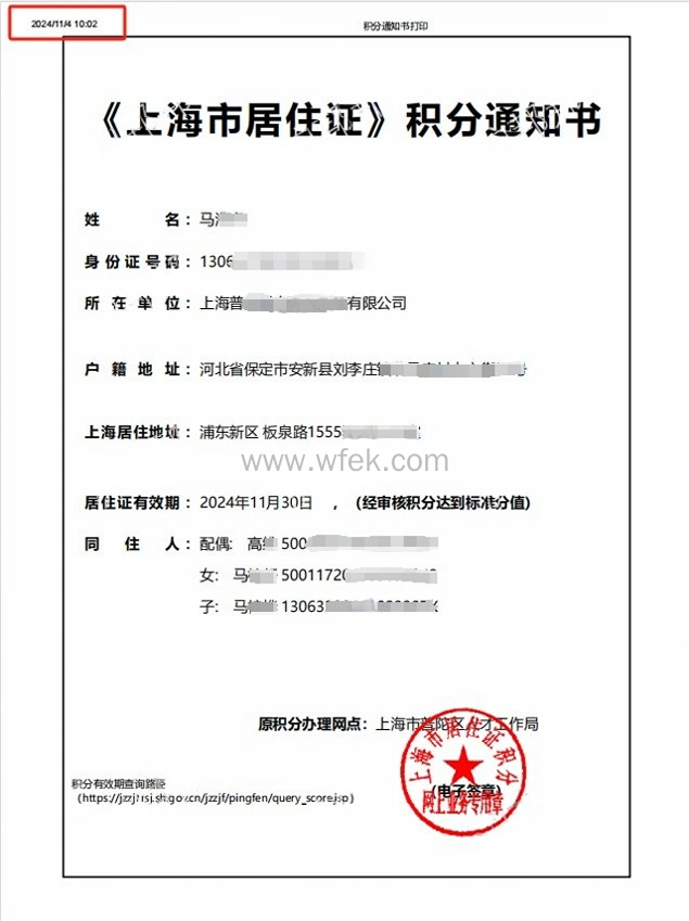 积分通知书可以网上打印,积分通知书长这样,会显示申请人信息和同住人信息