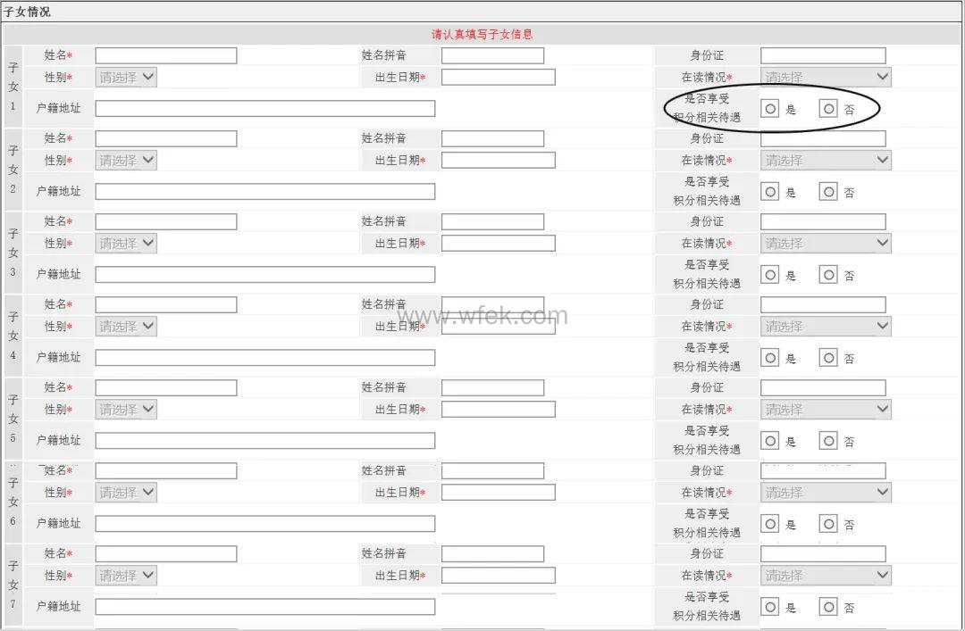 将要添加的子女的信息填写完整,有一点需要特别注意的【享受积分待遇务必要填写:是】,如果是配偶已经办理了积分,并且子女已经享受积分待遇,则这项可选【否】。