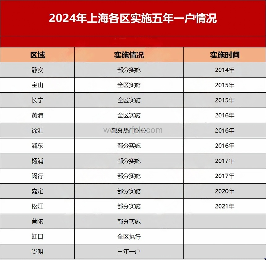 静安区、闵行区、浦东新区、嘉定区、松江区:仅针对区域内的特定学校执行“五年一户”政策。