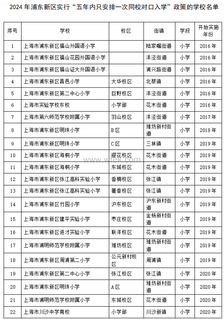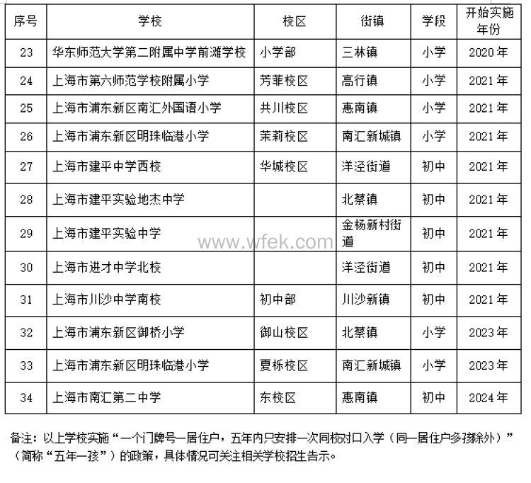 继续在部分学校实行“一个门牌号一居住户,五年内只安排一次同校对口入学(同一居住户多孩除外)”的政策,新增上海市南汇第二中学(东校区),共有34所学校实行此政策。