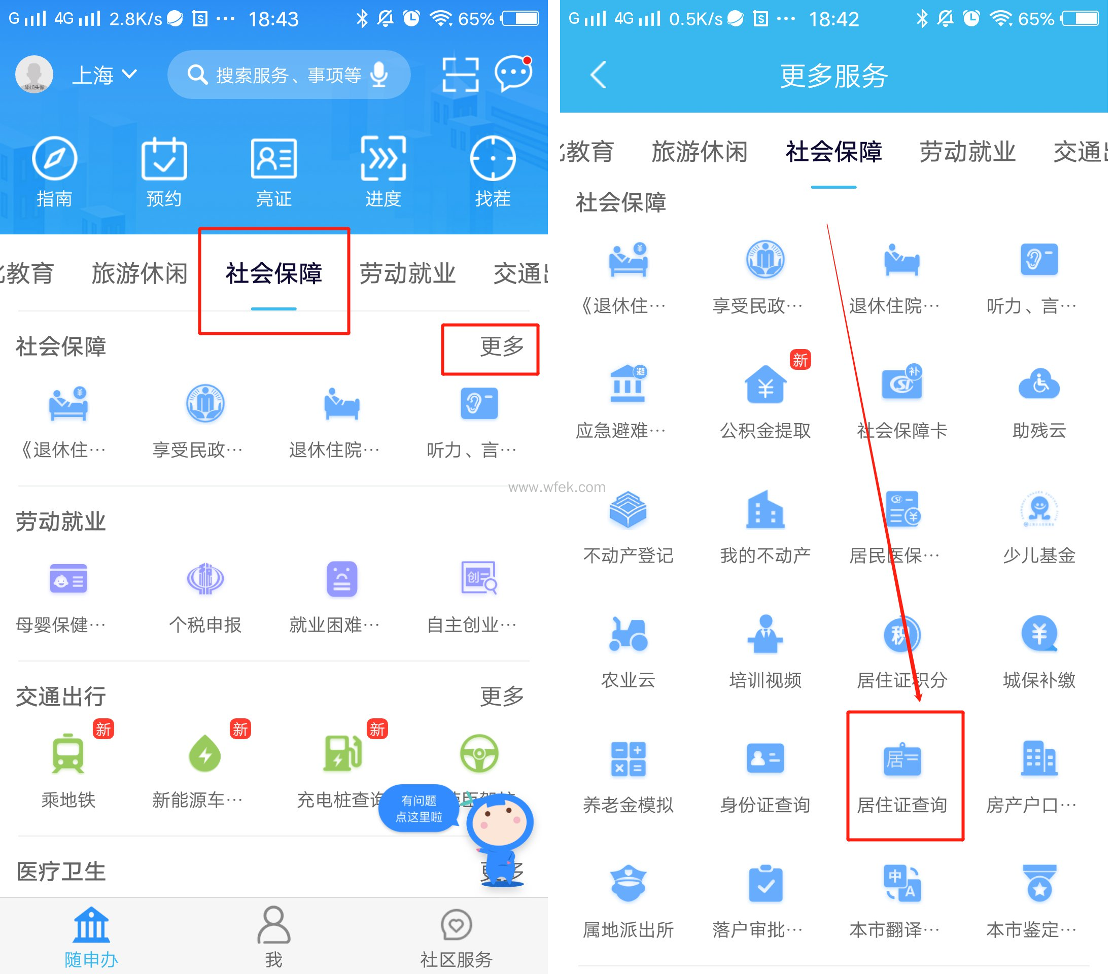 2、在下方菜单栏找到"随申办",然后点击在页面菜单栏中找到“社会保障”,点击更多,然后点击进入找到“居住证查询”,然后点击进入下一步(如下图所示);